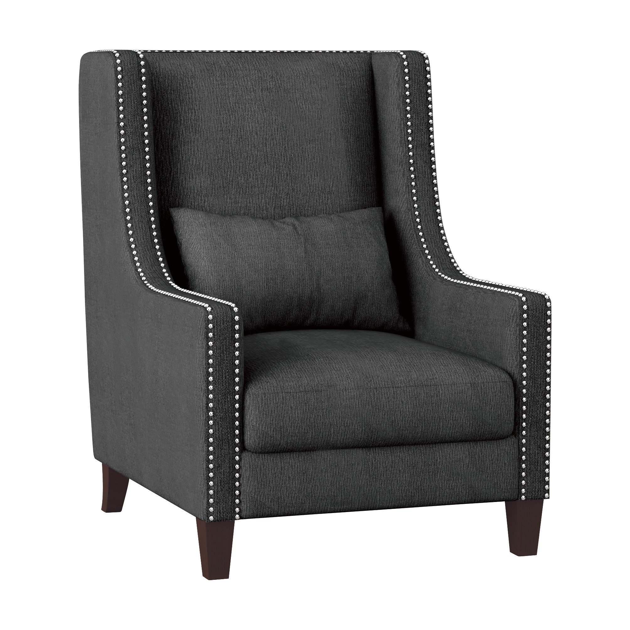 Modern-traditional styling is perfectly executed in the design of the Keller Collection. The high-back profile of this elegant accent chair is defined by nailhead trim and its seating is enhanced by the back-supporting kidney pillow. This accent chair is offered in dark gray for versatile placement within your decorative scheme. Also available in light gray.PRODUCT DIMENSIONS: Overall Dimension: 29" x 32.75" x 38.25"HSeat Width: 20.25"Seat Depth: 22.5"Seat Height: 19.75"Arm height: 23"Pillow dimension: 19.5"x 12" (1)Listing Includes: One Accent Chair Only.Simple Assembly Require.