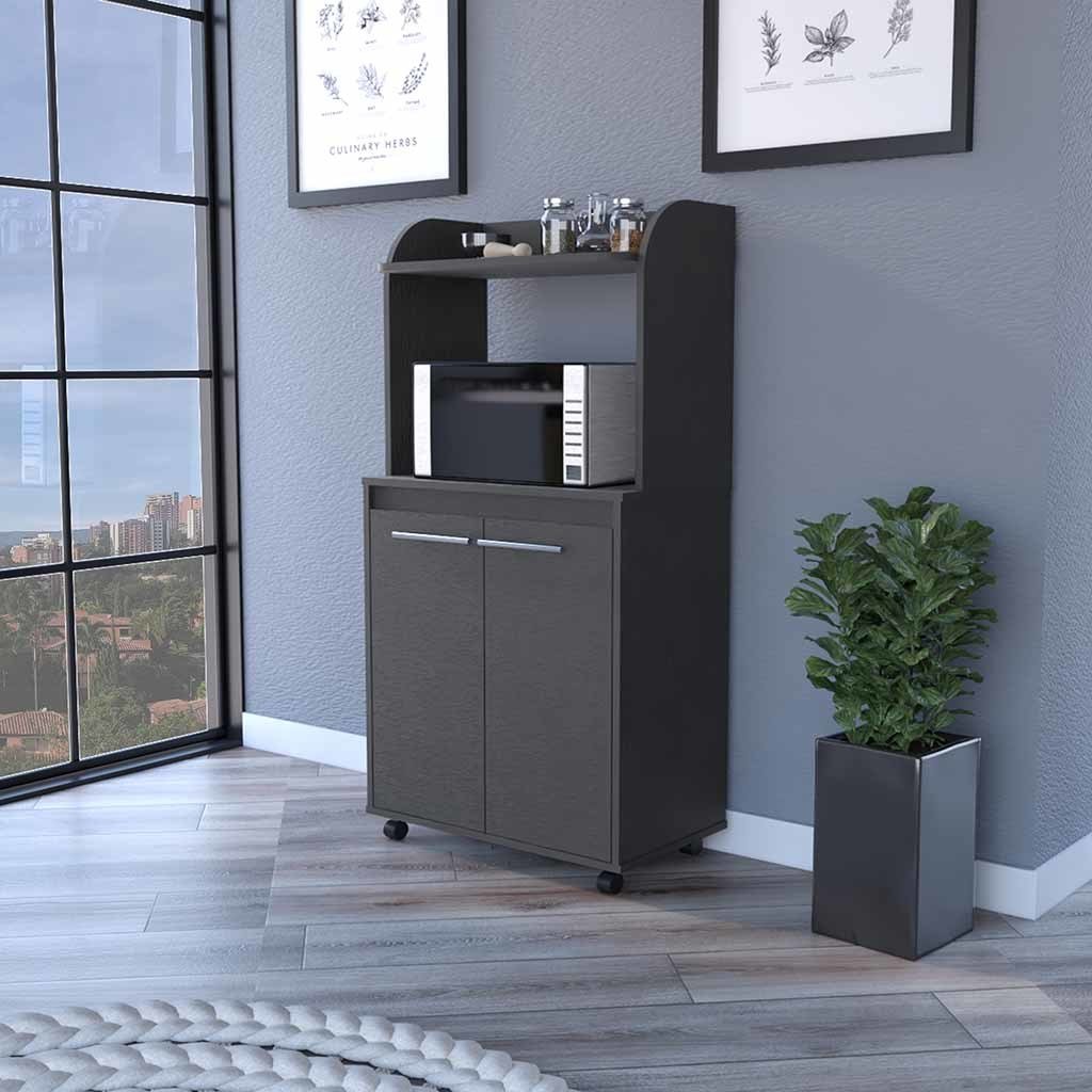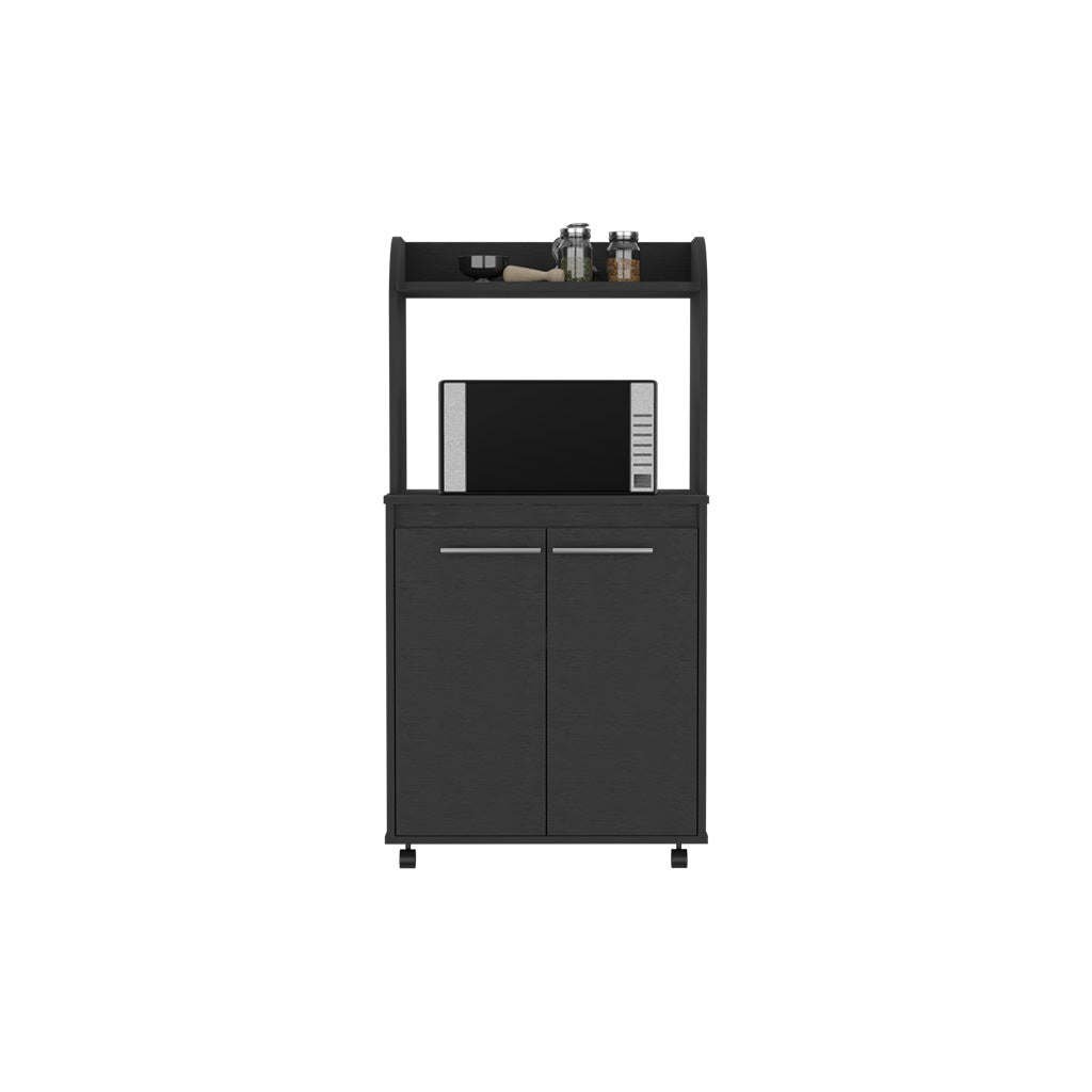 Totti Kitchen Cart is perfect for anyone who wants to add a little more convenience and mobility to their kitchen. With four caster wheels (1,77''), this cart can be easily moved around the kitchen, and the shelf designed specifically for your microwave (15,70''H X 23,34''W) means that you'll never have to worry about where to put it again. Includes a two-door cabinet with two internal shelves (11,49''W X 10,51''H), as well as a large countertop. Designed with elegant Black manufactured wood finish.Dimensions:Height: 49,23" Width: 24,84' Depth: 14,19'Furniture Type: Ready to assemble (full assembly required).Certifications: CARB phase II compliant – TSCA Title VI Compliant.Warranty: 1-year warranty coverage in wooden parts- 1-year warranty coverage in hardware pieces since its manufacturing date is found in the lot number printed in the product box.Shipment details: Free shipping to the 48 contiguous states - delivery time: Between 2 and 5 days depending on the customer's location, season, and weather factors. Other details: This product does not include decorative or background elements; Check that the box is in good condition, and well packed, and check with the help of the manual that the corresponding parts have been included; For more information regarding warranty, shipment details, cancellations, returns & replacement parts go to the bottom section of our website to learn more; Installation & Assembly Instructions included.