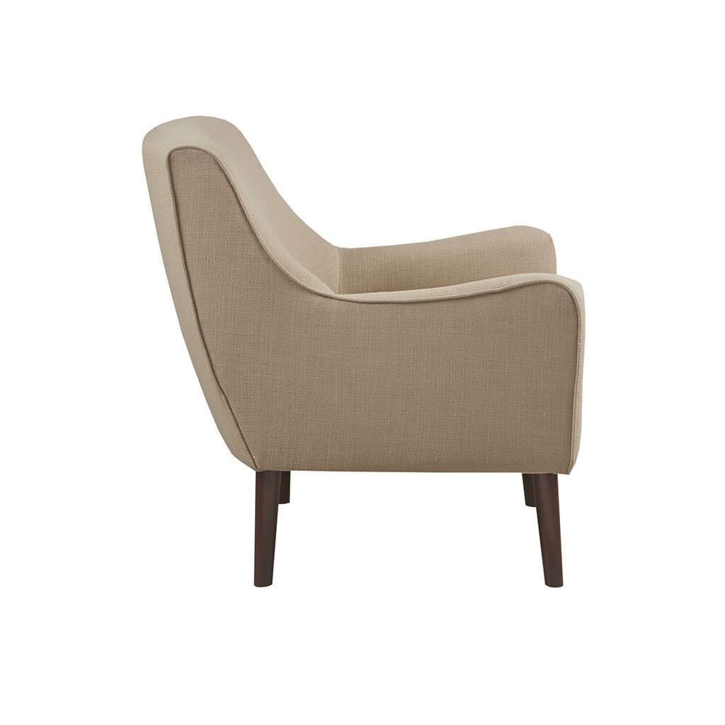 Update your living room with the Madison Park Oxford Mid-Century Accent Chair. Featuring mid-century inspired curves, this chair is upholstered in a soft sand fabric that adds a light contrast to the room decor. The frame is composed from select hardwoods and plywood and is elevated on smooth tapered wooden legs in espresso finish. Removable cushion, not reversible. Leg assembly required.