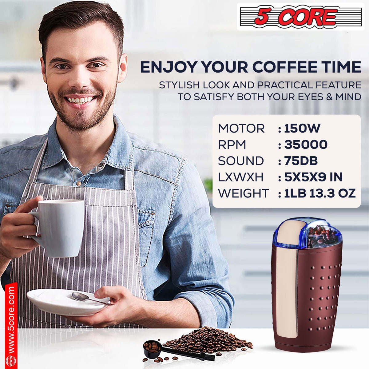 1.Efficient: The 5 Core coffee grinder features a 150W copper motor that grinds fast and preserves aroma; it has 35000 RPM, 75 dB max motor sound for quiet operation, and a large 50-gram capacity.