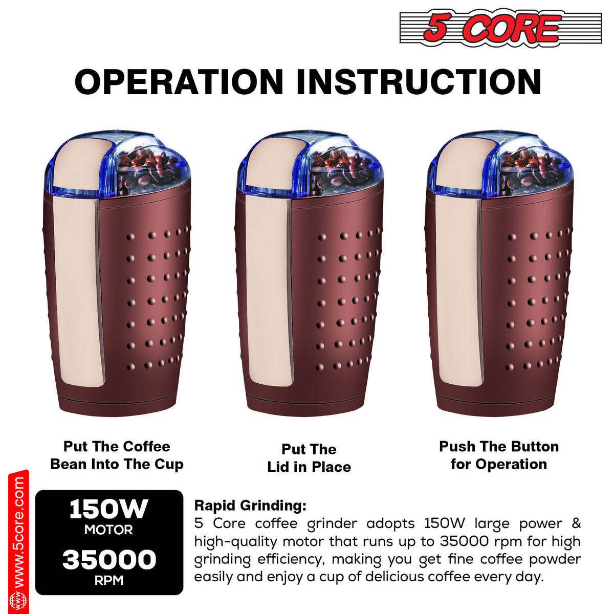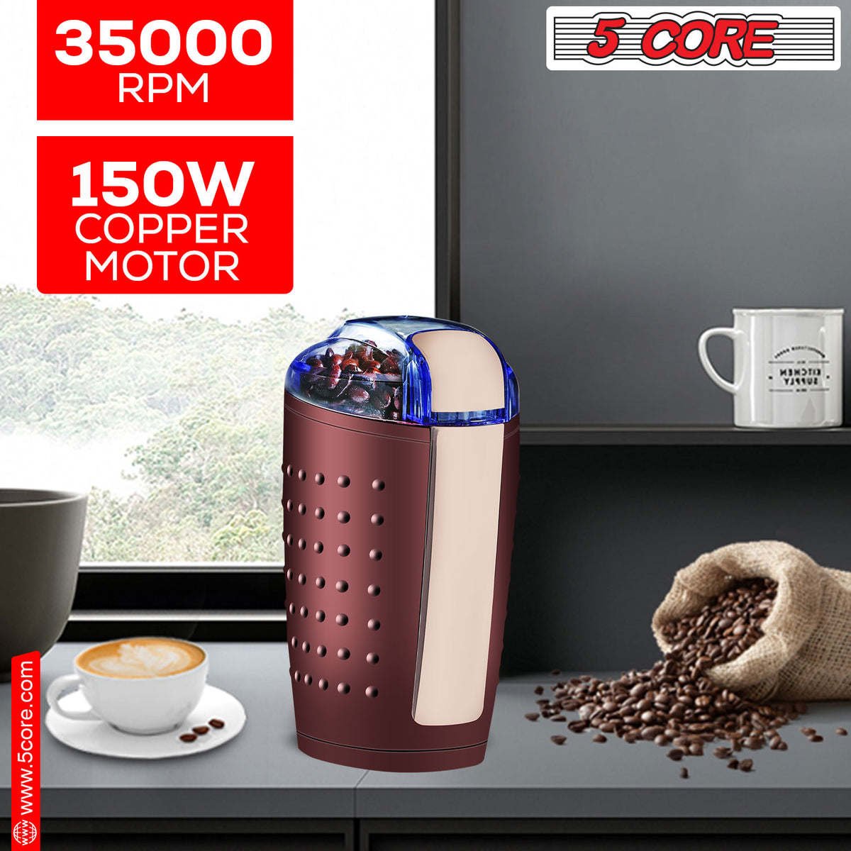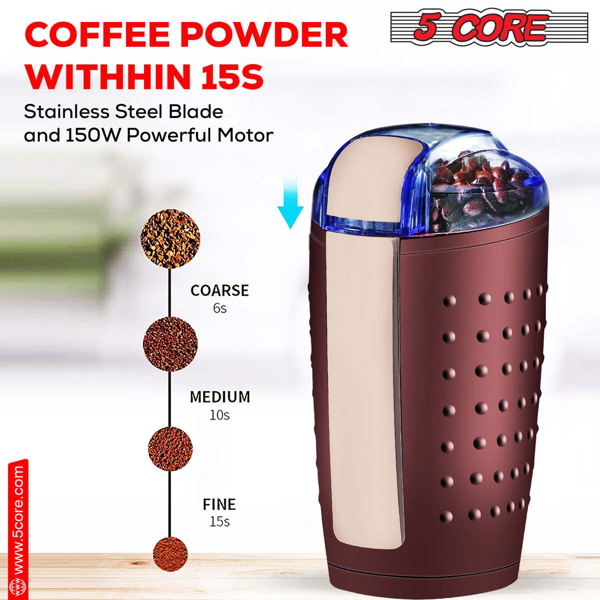 Home > 5 Core Coffee Grinder • 85 Gram Or 3 Ounces / 12 Cup Capacity • One-Touch Automatic Electric Bean Spice Grinding Machine • 150W Copper Motor •