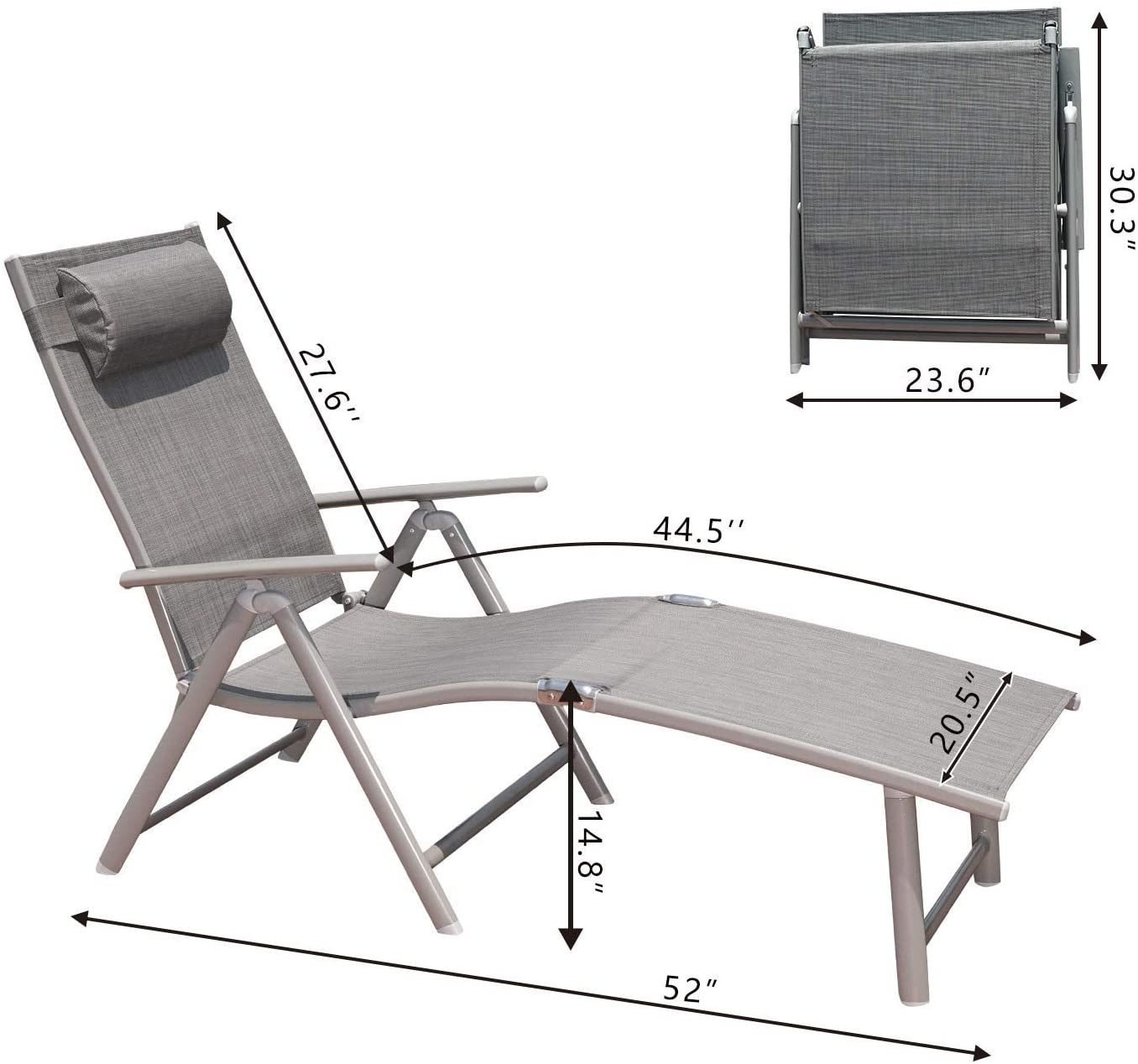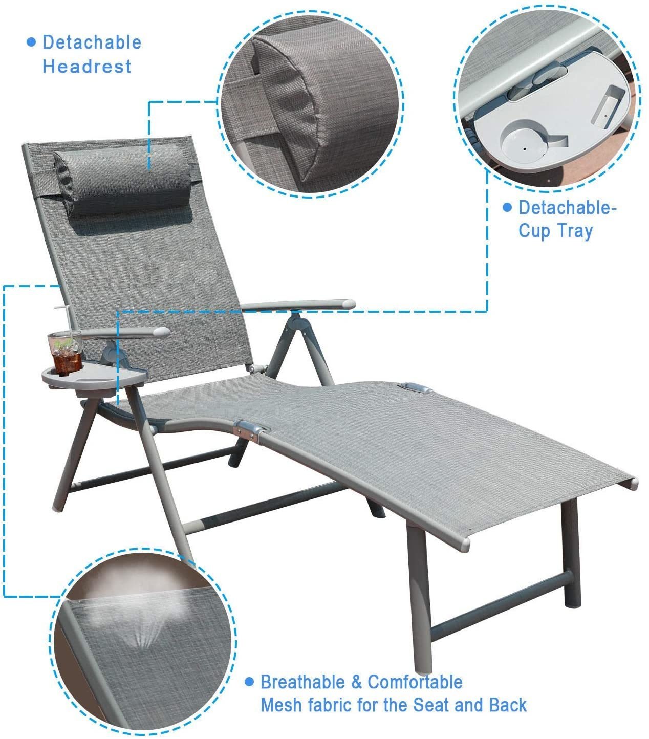 Adjustable reclinning lounge chair : By lifting the armrests on both sides, you can adjust the back of the recliner to seven different angles. The footrest can also be put down or raised up according to your needs.Durable Aluminum Frame: Featuring heavy-duty aluminum frame, the chaise lounge chair is able to withstand heavy weight which is up to 350 lbs. Moreover, the selected aluminum material not only makes the recliner lighter than others, but also resists well to rust and deformation.