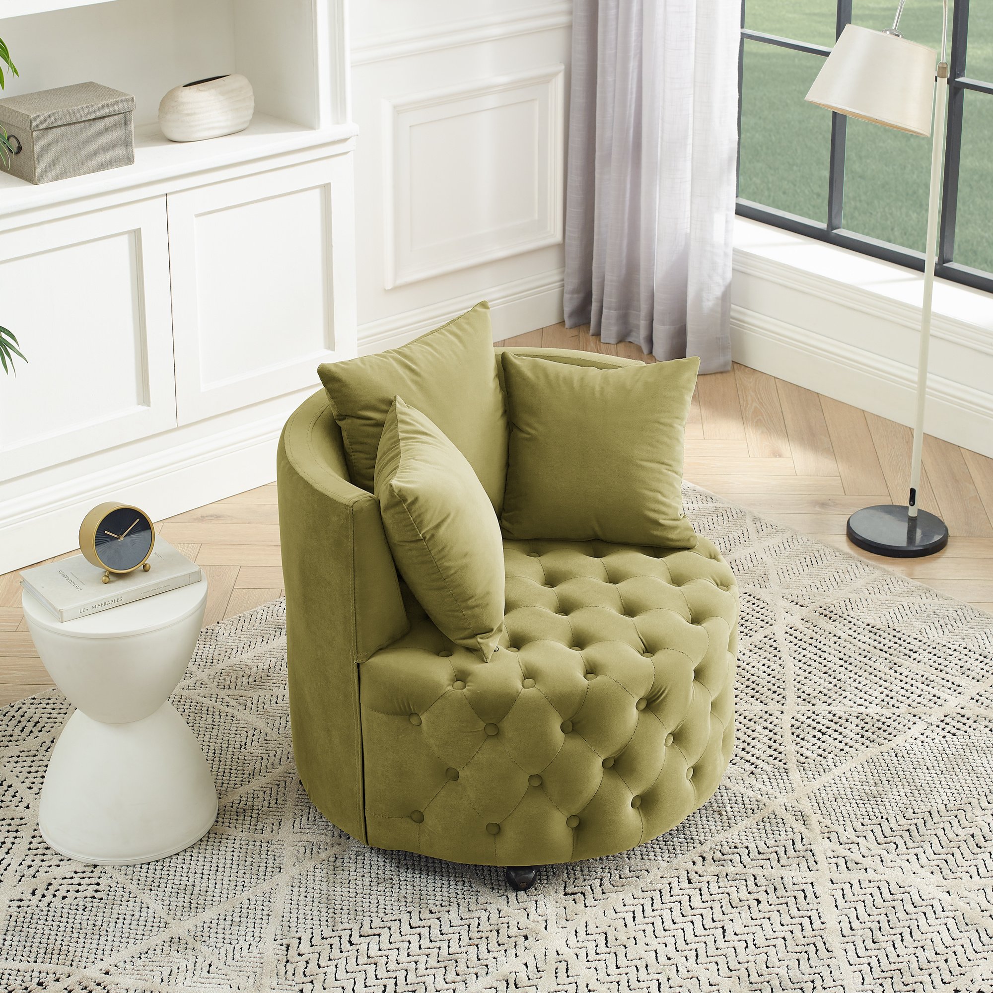 Home > Velvet Upholstered Swivel Chair for Living Room, with Button Tufted Design and Movable Wheels, Including 3 Pillows