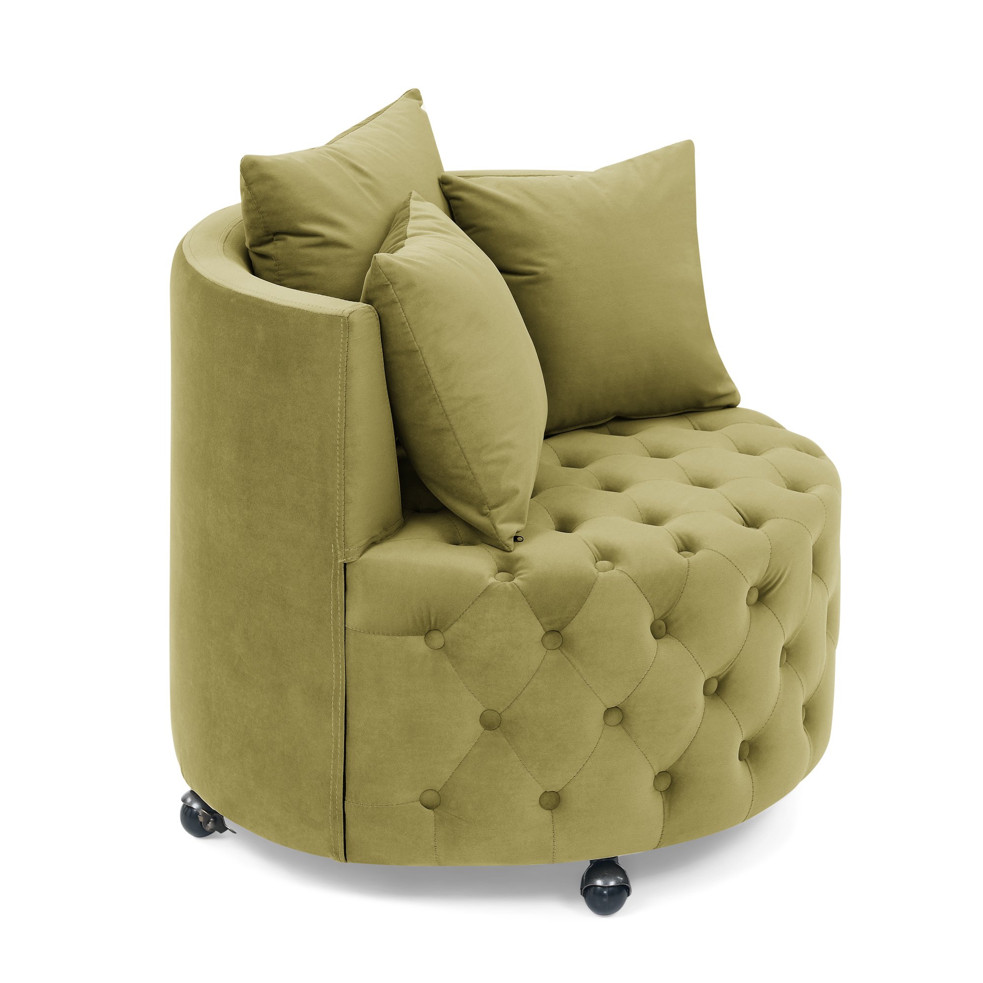Velvet Upholstered Swivel Chair for Living Room, with Button Tufted Design and Movable Wheels, Including 3 Pillows