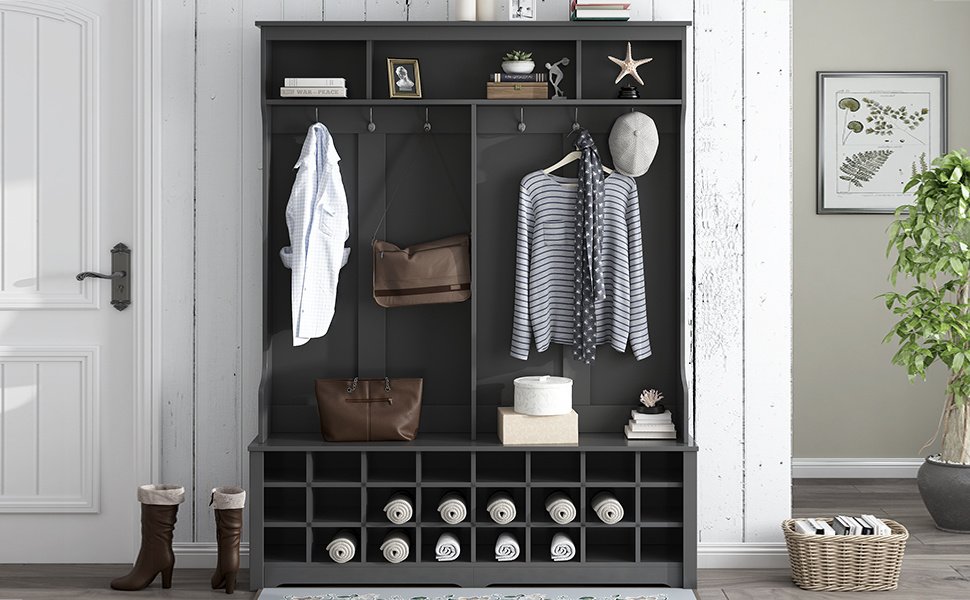 The three upper compartments can accommodate different size of big items; and the six metal hooks can hang your jackets; scarves; purses and hats. The wide bench sits on top of 24 individual shoe cubbies; and it has plenty of space to allow you sit on it to change the shoes. Each shoe cubby is spacious enough to hold a pair of canvas shoes; keeping them neatly stored and out of the way.