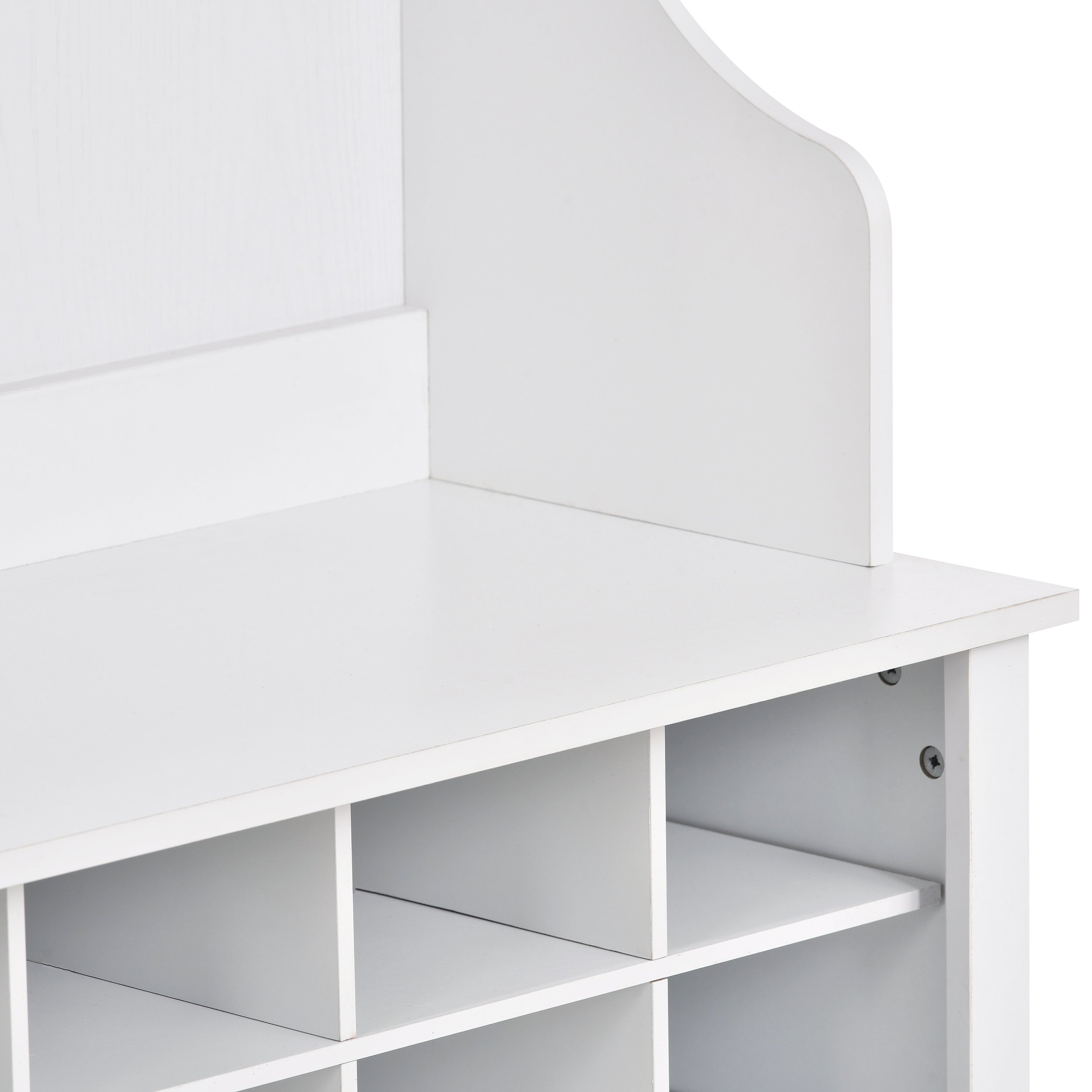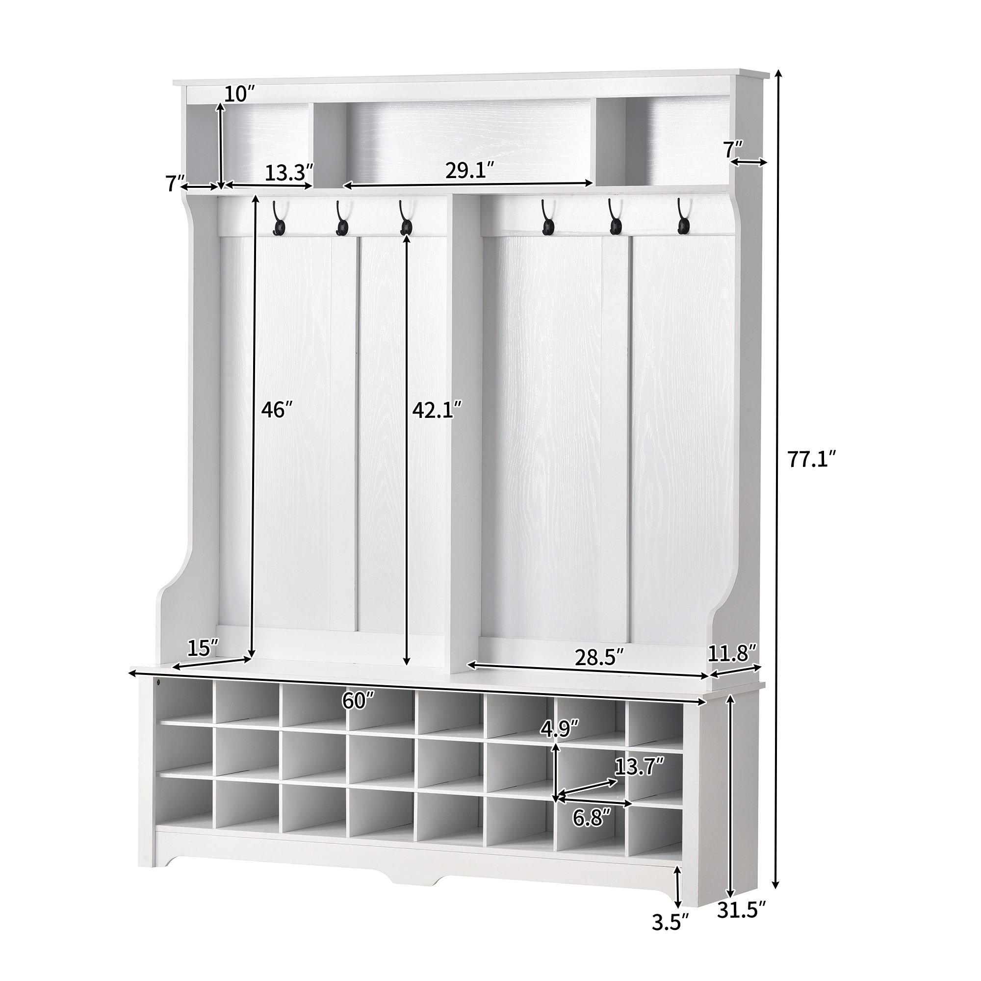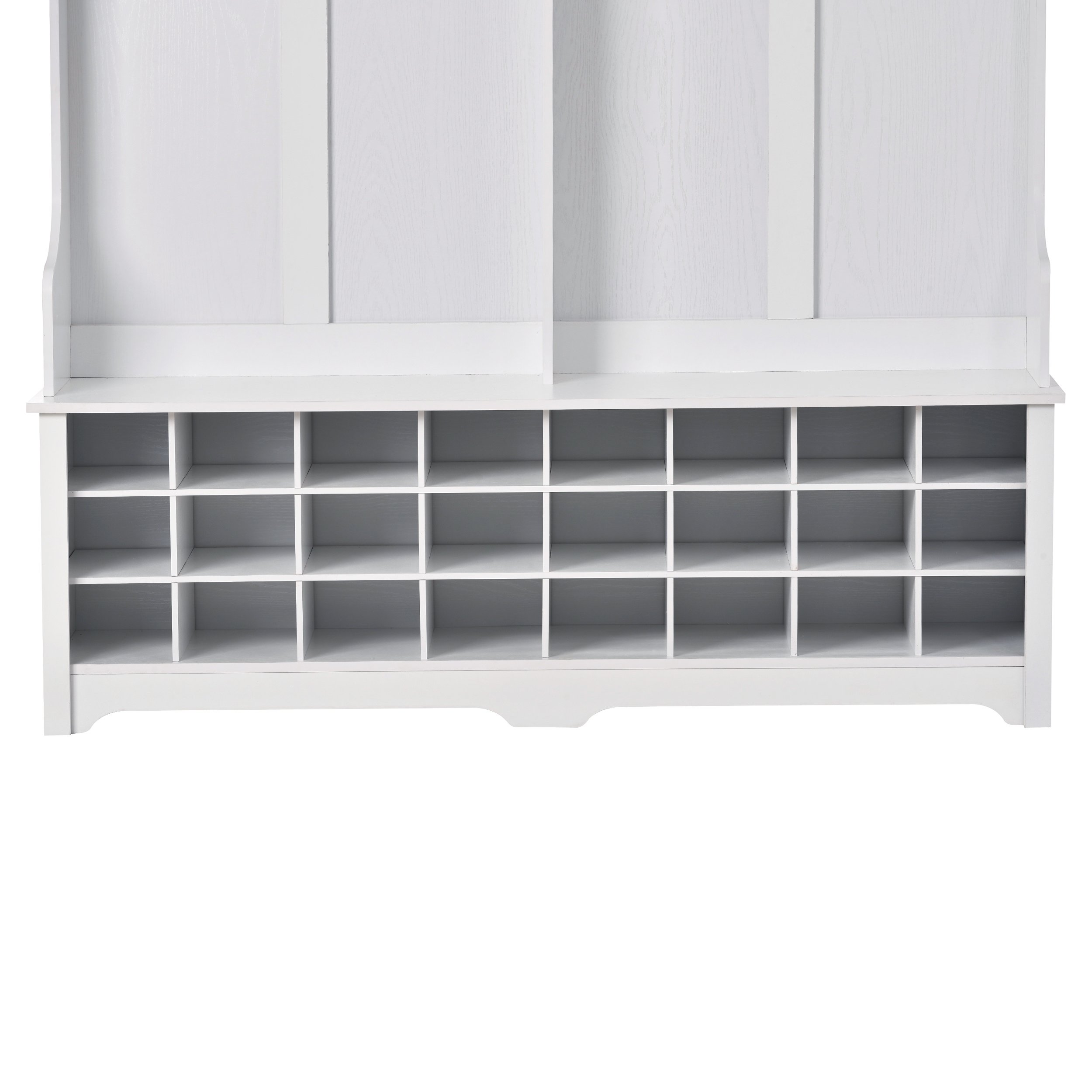 The three upper compartments can accommodate different size of big items; and the six metal hooks can hang your jackets; scarves; purses and hats. The wide bench sits on top of 24 individual shoe cubbies; and it has plenty of space to allow you sit on it to change the shoes. Each shoe cubby is spacious enough to hold a pair of canvas shoes; keeping them neatly stored and out of the way.